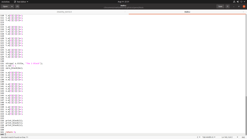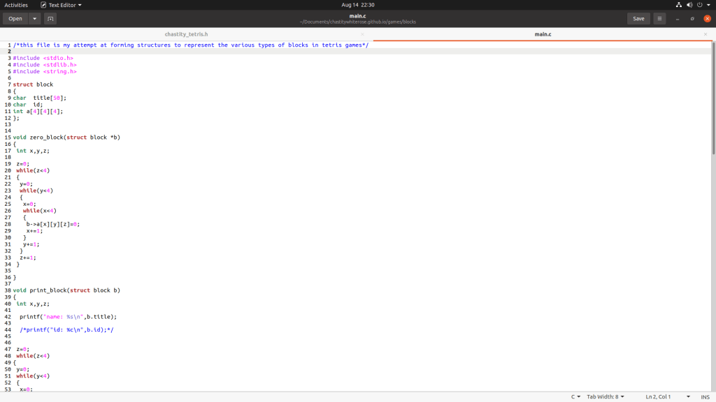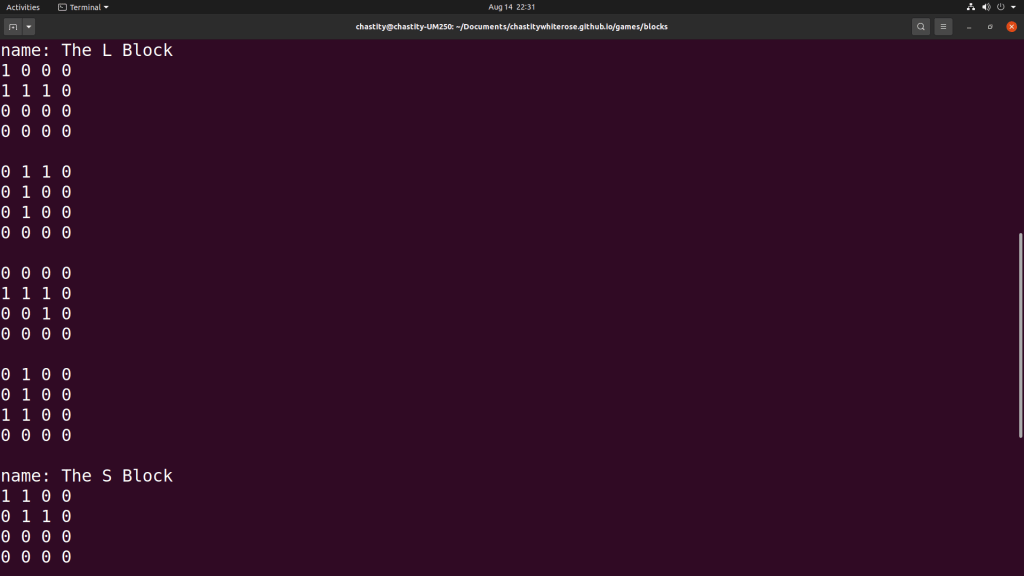 So I developed a sort of working model for how Tetris blocks can be represented as a 3 dimensional array. I am using structures in a C program to keep track of them. Theoretically this could be used in a tetris clone but it’s important to get all the math right first so I have a function that can print text to the console to get an idea of what it would look like.