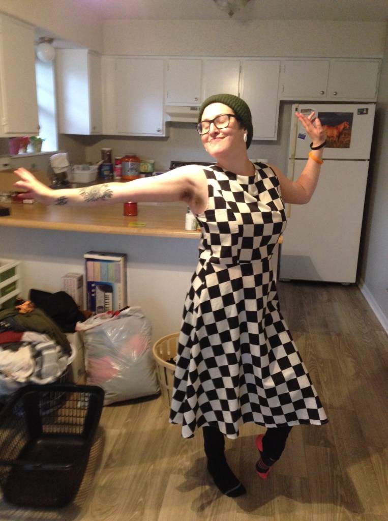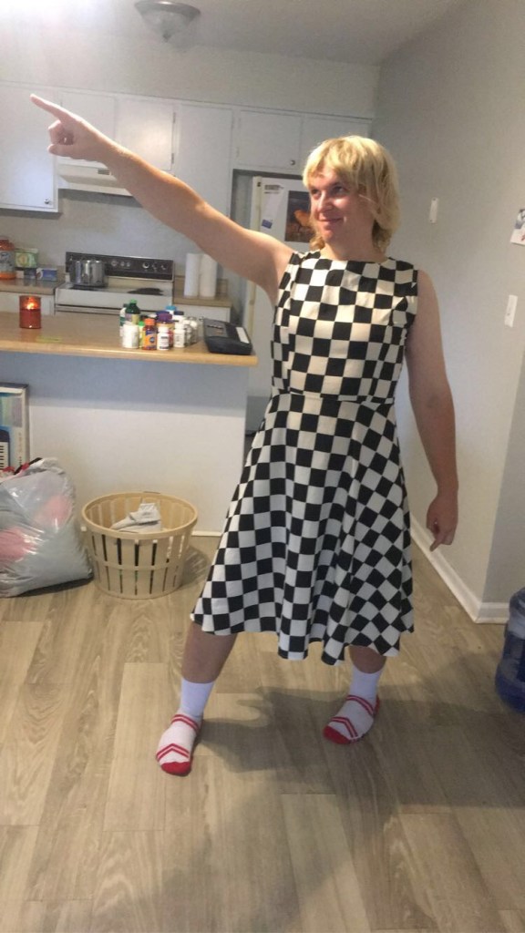 The checkerboard dress you see in these pictures was one I bought myself around the time of my 31st birthday when I came out as transgender for the first time. River and I were playing around with it and taking some memory pictures. It was a good time.