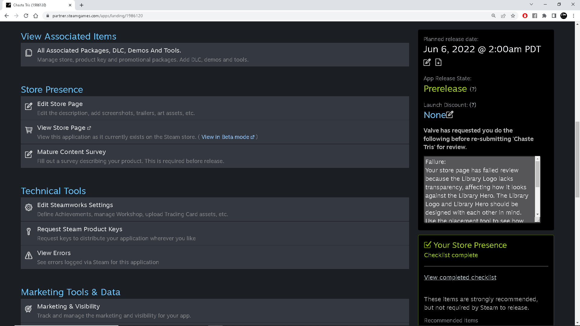 The process of becoming a steam partner and going through several reviews has not been easy because creating a dozen images with strict requirements and having to fix them while visiting several pages on the website and filling in the fields completely consumed many hours of my nights.