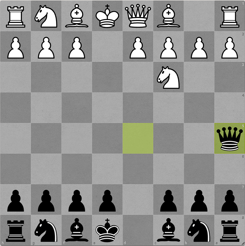 At this point I know what you’re thinking. You’ve probably been told it is a bad idea to bring your queen out early. Generally, this is true, but if you’re smart about it, you can keep your queen safe and hopefully still get your other pieces active. What will happen 95% of the time is that white will attack your queen with a C3 knight right away. When this happens, you want to move the queen to A5.