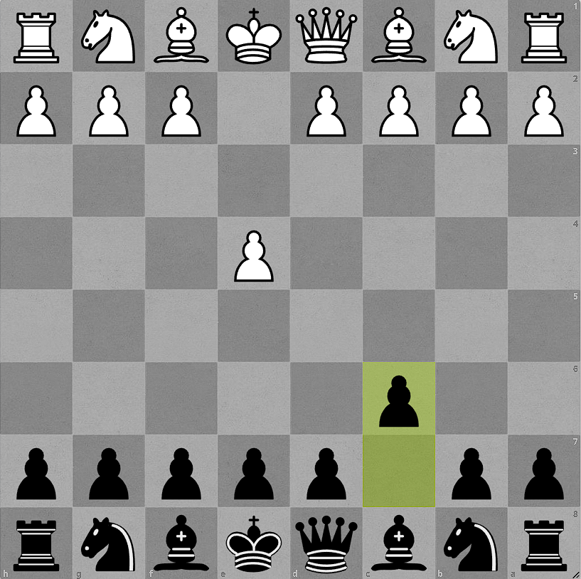 You may look at this and wonder what the point is of black moving the pawn to C5. It accomplishes a few things. First, it means that white cannot move their Queen’s pawn to D4 without it being captured. Second, it does allow black’s queen to put the white king in the event that white ever moves that queen’s pawn one or two spaces.