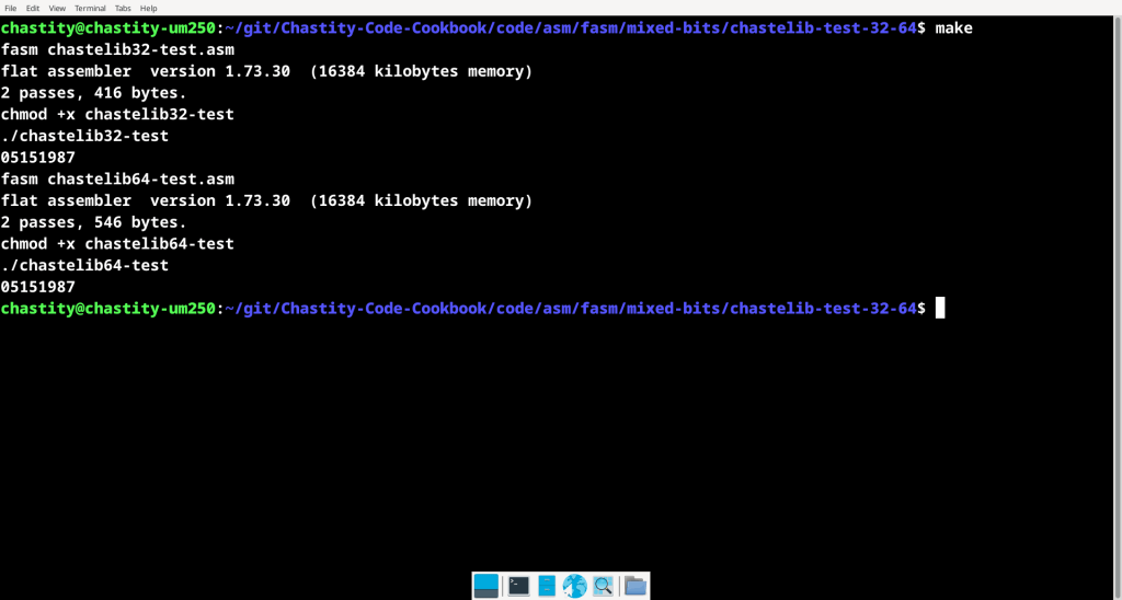 Basically, my program has a binary input string which is the same as the decimal number that looks like my birthday. This program was a basic test of “chastelib”, my Assembly Language library of functions for input and output. Writing these IO routines is one of the hardest parts for most assembly language programmers.
